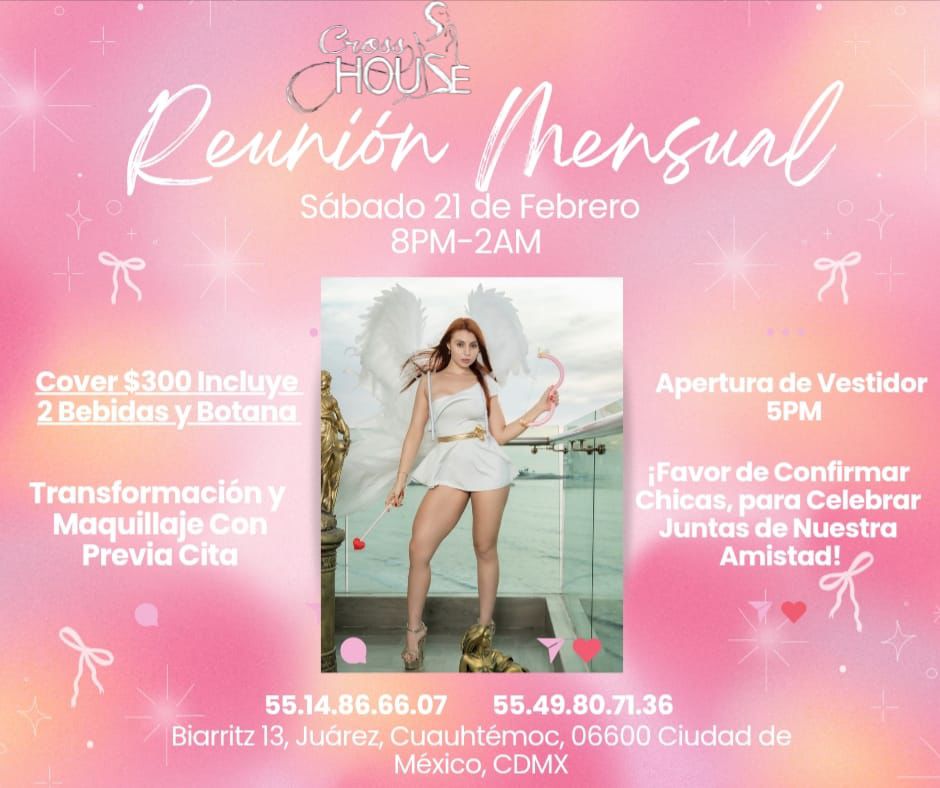 REUNIÓN MENSUAL Cover $300 incluye 2 bebidas y botana. Transformación y maquillaje con previa cita. Apertura de vestidor 4pm. Telefonos: 5514866607 y 5549807137 Biarritz 13, Juárez, Cuauhtémoc, 06600 CDMX
